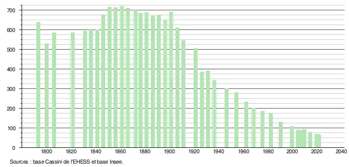 L'évolution du nombre d'habitants est connue à travers les recensements de la population effectués dans la commune depuis 1793. Pour les communes de moins de 10 000 habitants, une enquête de recensement portant sur toute la population est réalisée tous les cinq ans, les populations légales des années intermédiaires étant quant à elles estimées par interpolation ou extrapolation[25]. Pour la commune, le premier recensement exhaustif entrant dans le cadre du nouveau dispositif a été réalisé en 2004[26].