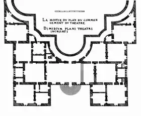 Un plan en est donné dans le livre de Jacques Androuet du Cerceau, Les plus excellents bastiments de France sous le titre La moitié du plan du commencement du théâtre. Les gravures d'Androuet du Cerceau doivent être interprétées car elles doivent mélanger le projet et la réalité. Une vue en plan générale montrant les deux châteaux de Saint-Germain-en-Laye donne le plan du Château-Neuf : un corps de bâtiment allongé en rez-de-chaussée cantonné de quatre pavillons où se trouvaient les appartements du roi et de la reine avec chambre et garde-robe dont le toit prévoit des combles habitables et un appartement des bains avec « estuves, baigneries et cabinet pour les dites estuves ». Le corps de bâtiment allongé comprenait une salle une chapelle et une antichambre. Devant la maison il y a une grande cour « en carré en forme d'un téatre, en laquelle y aura quatre grands demys ronds à l'endroict des quatre pans carrez d'icelle en saillie hors la quadrature desd. pans carrés ». La cour s'ouvrait vers le Château-Vieux. Par rapport à la description du marché, le plan d'Androuet du Cerceau montre un double mur entourant la cour qui a été interprété comme étant une galerie. Sur une vue cavalière dessinée par Androuet du Cerceau et conservée au British museum montre deux ailes de part et d'autre de la maison, à l'est, dominant une terrasse à laquelle on accède par un escalier.
