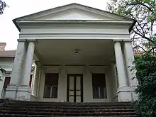 Le bâtiment, de forme rectangulaire, s'étend sur un terrain plat selon un axe nord-est sud-ouest ; il est séparé des dépendances par une grille en fer forgé à valeur décorative. De style monumental, il est constitué d'un rez-de-chaussée et est caractéristique du style néo-classique[2],[3]. La façade avant est ornée d'une rampe d'accès et d'un porche couvert avec un fronton triangulaire soutenu par quatre colonnes. La façade arrière, donnant sur le parc, possède une terrasse reposant sur un haut piédestal ; elle est rythmée par des colonnes alternativement circulaires ou carrées aux chapiteaux doriques supportant un fronton[2],[3]. Sous l'édifice se trouve une haute cave dotée d'une « voûte prussienne » et de solives qui soutiennent le plancher en bois de l'étage[2].