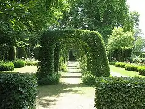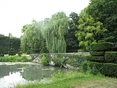 Deux pavillons de style Renaissance tardif marquent l'entrée des jardins. Ils datent du début du XVIIe siècle, de même que les canaux des jardins qui entourent le « Carré de l'Île » et le canal de dérivation qui alimente le moulin maintenant « Bassin de la Roseraie ».