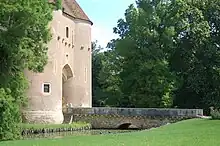 - la partie médiévale : elle vaut au château d'Ainay-le-Vieil d'être surnommé « le petit Carcassonne »[4]. En effet, de l'époque féodale nous est parvenu une enceinte octogonale du XIVe siècle construite sur l'emplacement d'une forteresse du XIIe siècle. Les hauts murs crénelés sertis de neuf tours sont équipées de meurtrières et d'un chemin de ronde. Ces courtines montant presque jusqu'au sommet des tours sont une disposition typique du XIVe siècle, permettant une meilleure circulation des défenseurs. L'aspect militaire l'emporte : l'entrée de la forteresse est défendue par un puissant châtelet qui, outre un système d'assommoir, était pourvu d'un pont-levis. Il est aujourd'hui remplacé par un pont dormant. Les douves, toujours en eaux, correspondent à un ingénieux système de canaux arrosant les jardins ;
