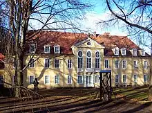 Le comte Christian Gottlieb von Holtzendorff hérite des terres en 1718. Il fait reconstruire le château en style baroque en 1724, entouré d'un jardin à la française et d'un parc à l'anglaise parsemés de statues. La cour d'honneur est agrémentée d'un grand bassin. Le château comprend plusieurs bâtiments dont le corps de logis à trois niveaux, avec un avant-corps au milieu de la façade d'honneur et de la façade arrière. Ces avant-corps sont ornés au premier étage de trois hautes fenêtres à la française, dont celle du milieu donne sur un petit balcon, et surmontées chacune d'un œil-de-bœuf, au-dessous d'un fronton élégant à la grecque, éclairé lui aussi en son milieu d'un œil de bœuf.