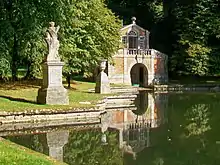 La fausse ruine d'un temple antique s'inscrit dans la transformation partielle du parc en jardin anglais, en 1881/83. Quant à l'embarcadère au nord du miroir d'eau, la littérature se tait sur le contexte et l'époque de sa construction. Le parc ne se visite que lors des Journées européennes du patrimoine et n'est pas visible depuis le domaine public.