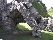 Vue de la basse-cour, montrant la porterie (à gauche), la tour Grant, la série de bâtiments (à droite) et les fondations de la chapelle (au centre).