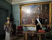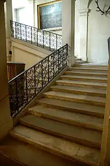 En haut de l'escalier, une tapisserie de Beauvais du XVIIIe siècle représentant une scène mythologique, un grand portrait de Louis XVIII, ainsi que le Sacre de Louis XV à Reims, peint en 1772, d'après le tableau de Martin des batailles au château de Versailles.