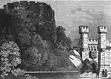 En 1825, le comté d'Yorkshire fit l'acquisition de la tour de Clifford et de la maison Waud pour 8 800 livres (l'équivalent de 665 000 livres de 2009)[45],[46]. Les nouveaux bâtiments de la prison, conçus par les architectes P. F. Robinson et George Townsend Andrews (en), furent construits dans le style gothique Tudor (en). Ils étaient composés d'un corps de garde haut de 11 mètres et de la prison elle-même, de forme radiale et protégée par un mur de pierre[47],[35],[48]. Cette prison, considérée comme étant la plus solide d'Angleterre, était entièrement construite en pierre afin d'être un lieu sûr et résistant au feu. L'utilisation d'un grès de couleur gris foncé lui donnait un aspect rébarbatif, mais la prison elle-même était saine et bien ventilée[48],[49]. La tour de Clifford ne jouait aucun rôle dans l'aspect de la prison, bien que le talus de la motte eût été coupé et remplacé par un mur de soutènement afin de laisser davantage de place à la nouvelle prison[45]. L'arrière-cour de la prison réservée aux femmes, que le nouveau mur cachait à la vue du public, fut utilisée pour les pendaisons à partir de 1868[39]. La réforme du système pénitentiaire britannique par le Prison Act de 1877 (en) fit passer le château d'York passa sous le contrôle du gouvernement l'année suivante. Elle servit de prison au comté jusqu'en 1900, date à laquelle les derniers prisonniers furent transférés à la prison de Wakefield. Les installations servirent dès lors de prison militaire[48].