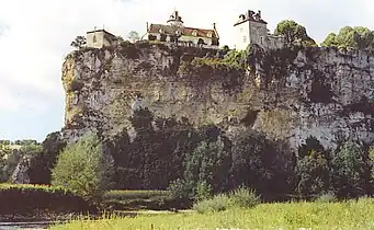 Au confluent de la Dordogne et de l'Ouysse, à 150 m d'altitude, il est en surplomb sur une falaise à environ 55 mètres au-dessus des rivières, dans le périmètre de 138 hectares d'un site inscrit le [2]. Le sentier de grande randonnée 6 l'approche par le sud en contrebas.