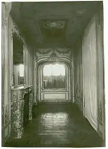 Après cette chambre à coucher se trouve une galerie d'une élégance & d'une délicatesse, qui fait honneur au goût de Madame de Pompadour, qui en a imaginé & tracé les desseins elle-même.