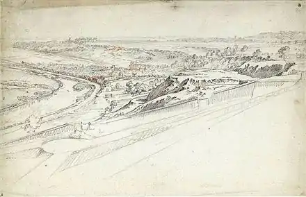 Au Midi, on aperçoit une partie du parc de Meudon, les jardins de Bellevue, surmontés des bois des cotiniers, & toutes ces magnifiques futaies qui s'élèvent en amphithéâtre.