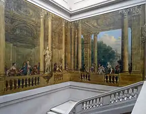 « L'escalier, qui conduiit aux appartemens du premier étage, a été peint par M. Brunetti[13], père, quant à l'architecture ; & les figures sont de M. Brunetti, fils : elles représentent Ariane & Bacchus, Zéphire & Flore, Diane & Endimion, Mars & Vénus : toutes ces figures sont encadrées avec art dans des masses d'une architecture noble & brillante. C'est bien dommage que l'obscurité, qui règne dans la partie inférieure, dérobe aux yeux le plaisir de bien voir ces beautés. La partie supérieure est très-bien éclairée & fait un bel effet. » (Piganiol, 1760).