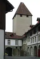 Vue sur le corps de logis avec les armoiries de Berne et le donjon carré | ||