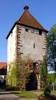 La porte supérieure qui est aujourd'hui l'entrée principale du château, a été construite en 1260 et était appelée porte de Säckingen. La tête d'envieux sur un bloc à bossage avait une fonction de repoussoir à démons. La porte originelle a été murée en 1530 car elle était devenue trop étroite. À sa place, on trouve aujourd'hui une fenêtre voûtée en plein cintre. On peut imaginer le vieux passage sur les pierres exposées. La nouvelle porte se trouve, vu de l'Ouest, à quelques mètres à droite de l'ancienne. En 1510 fut construite une tour ronde du côté nord du bâtiment d'entrée et en 1533 fut ajoutée une forge du côté de la cour intérieure. La tour actuelle fut construite en 1534 parmi les parties les plus anciennes du mur d'enceinte. Étant donné que cela s'est passé sous le règne de George d'Andlau, le blason de ce dernier orne l'arche. Après la guerre de Trente Ans, en 1663, on renforça la porte et on rajouta un étage de colombages. De cette époque correspondent les armoiries du commandeur Johann Hartmann von Roggenbach. Devant le passage, il y avait, à l'origine, un pont levis qui enjambait les douves. Une partie du mécanisme du pont levis est encore reconnaissable aujourd'hui. Un petit pont traverse la douve à l'intérieur de l'espace. Au sud de la porte se trouve la porterie. Une auberge et l'appartement du portier étaient là.