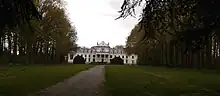 La façade postérieure présente un plan incurvé, entre l'avant-corps central en arc de cercle, orné de colonnes supportant une massive corniche surmontée d'un toit en coupole, et les ailes en retour.