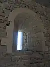 La partie basse est couverte d'une voûte en berceau, deux portes disparues (visible par négatif) permettaient l'accès par la cour. Les murs Nord et Sud disposent d'une fente menant aux flanquements.
