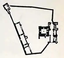 Au sud-est du donjon se trouvait la salle, construite par Roger Clifford à la fin du XIVe siècle pour remplacer l'ancienne. Il s'agissait d'un espace réservé à la garnison du château, gonflée par les guerres anglo-écossaises, ainsi que d'un lieu où le seigneur prenait ses repas avec les soldats. La salle avait de grandes fenêtres qui ont peut-être nui à la capacité de défense du bâtiment, mais les vantaux sont supposés avoir été dotés de grands volets en bois. L'unique cuisine du château était placée dans le coin sud-est de la fortification. Le long du mur sud se trouvaient d'autres logements, un puits, et une chapelle, cette dernière faisant partie des ajouts de Roger Clifford. Dans le coin sud-ouest du château se tenait la Tower of League, une tour construite autour de 1300 par Roger Clifford. Elle comprenait d'autres pièces pour le logement, mais permettait également aux défenseurs de tirer sur un ennemi émergeant de la guérite. Elle possédait quatre étages composés d'une pièce unique chacun. La présence d'une garde-robe et d'une cheminée à chaque étage suggèrent que la tour était réservée aux visiteurs de statut élevé. Le plan carré de la tour est typique de ces structures construites dans le Nord de l'Angleterre à cette époque, comme on le voit dans les châteaux tels que celui de Warkworth et d'Egremont, et contraste avec les tours rondes préférées dans le sud.