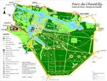 Le parc de Chantilly couvre 115 hectares[8], dont 25 hectares de plans d'eau, auxquels il faut ajouter les 60 hectares du parc de Sylvie. La forêt de Chantilly, qui s'étend sur 6 310 hectares, fait partie intégrante du domaine.