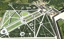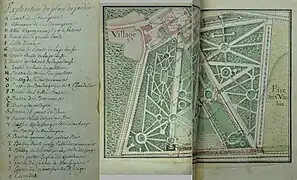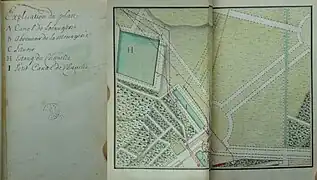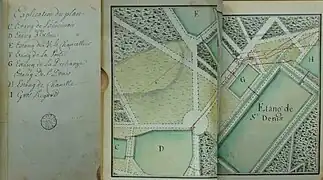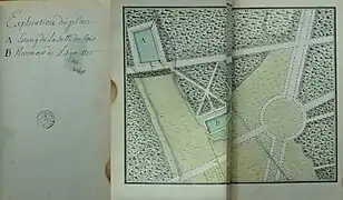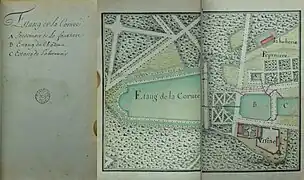 L'aménagement autour du nouveau château est connu principalement grâce à un plan "levé et dressé par M. De Roux, Garde du corps dans la compagnie de Noailles", repris par Le Rouge[3].