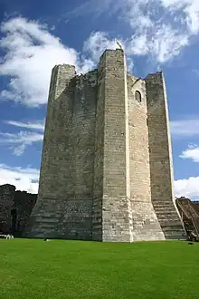 Le donjon de Conisbrough est positionné du côté nord-est de la cour intérieure[42]. Il s'agit d'une survivance médiévale importante : l'historien Sidney Toy le considère comme « l'un des plus beaux donjons d'Angleterre », l'archéologue Oliver Creighton le décrit comme un « joyau architectural » et Stephen Johnson comme « l'un des plus beaux exemples de l'architecture normande tardive »[43].