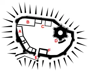 Plan de la basse-cour intérieure du château au début du XIIIe siècle. Légende : A – bloc solaire ; B – salle ; C – cuisine et garde-manger ; D – donjon et escaliers ; E – barbacane et guérite ; F – chapelle.