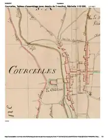 Sur l'extrait du cadastre napoléonien, le château marquait l'entrée dans le village de Courcelles. Aligné sur la route en provenance de Bouilly-en-Gâtinais, l'entrée principale, dite d'honneur se situait donc à l'ouest. On constate également que les douves ont été représentées de la même couleur que la Rimarde (rivière à droite sur le plan), ce qui peut présumer qu'à cette époque les douves étaient encore en eau[4].