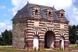 Son appareil alterne la pierre rouge de Troisgots et du calcaire de Caen, et rappelle une disposition adoptée par Gabriel lors de la construction du château de Torigni-sur-Vire, pour Jacques de Matignon et de celui de Canisy pour Hervé de Carbonnel (1558-1625), gendre de Matignon[4].