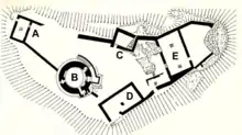La tour occidentale, de forme rectangulaire, était de taille réduite et servait à défendre la pente la plus vulnérable de la colline[23]. La tour similaire du côté sud protégeait quant à elle l'entrée du château[24]. Au nord se trouve la grande salle, qui occupe toute la largeur de la cour, et à l'est se trouve un autre bâtiment, probablement édifié à la fin du XIIIe siècle par les Anglais[28]. Malgré sa grande taille (15 m de long sur 8 de large), la grande salle est conçue de manière moins sophistiquée que ce que l'on peut observer en Angleterre à la même époque, où il est de plus en plus fréquent d'avoir une combinaison de grande salle, chambre et pièces utilitaires[29],[30].