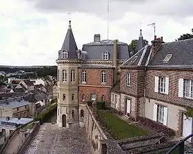 Vue de la ville, à droite du pavillon principal[11], se trouve un autre bâtiment accolé au premier mais posé en deçà de l'ancien rempart, construit en calcaire (rez-de-chaussée) et briques rouges (étage), surmonté d'un toit à deux pentes et à pan coupés aux extrémités. Il s'agit d'un bâtiment de service du logis actuel, où se trouvent les cuisines et les salles de domesticité. À son extrémité se trouve enfin une grosse tour sur deux niveaux, remaniée, mais qui ne s'élève pas au-delà du jardin intérieur.