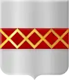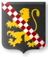 De sable au lion d'or, lampassé et armé de gueules, et d'une barre oblique en deux rangées d'argent et de gueules sur le tout. |