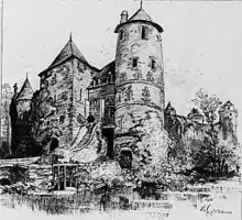 La cour intérieure avec les tours Suriennes et Raoul. En arrière-plan, l'église Saint-Sulpice.