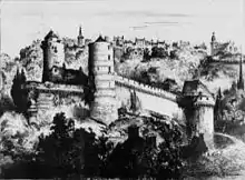 À l'origine, il s'agit d'un donjon en bois qui occupe le point le plus élevé du site[3],[4]. L'enceinte en bois sera remplacée à partir du XIIIe siècle par une muraille en pierre[5]. C'est aussi à cette époque que la ville est ceinte d'un rempart[4].