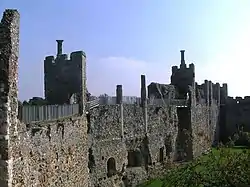 La cour intérieure, ou le château, se trouve de l'autre côté du mur d'enceinte. On peut y accéder en traversant un pont datant du XVe siècle qui a remplacé l'ancien pont-levis qui se trouvait au même endroit. La tour située à l'entrée du château et permettant d'y pénétrer est d'un aspect relativement simple datant du XIIe siècle : le corps de garde, de style beaucoup plus grandiose, est une mode qui commença peu de temps après. Cependant, Thomas Howard, 2e duc de Norfolk, fit remodeler cette entrée au XVIe siècle en y ajoutant son blason et des décorations supplémentaires sur les murs. La cour intérieure est située autour d'une courtine faite de pierre de silex local et de pierre formée par concrétion. Elle fait 10,5 m de hauteur et 2,3 m d'épaisseur et est protégée par treize tours murales carrées aux fonds ouverts, chacune d'entre elles mesurant environ 14,3 m de haut et possédant des coins en grès. Un chemin de ronde permet de parcourir le sommet des tours et du mur.