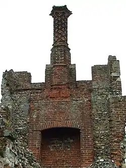 Autour de la cour intérieure, on peut voir un certain nombre de cheminées en briques gravées, datant de la période des Tudors, chacune d'entre elles ayant un style différent. Cependant, à l'exception de trois d'entre elles, elles sont purement décoratives et l'historien R. Allen Brown les décrit comme étant un élément « regrettable » pour le château d'un point de vue architectural. Deux des cheminées fonctionnelles Tudor sont formées de conduits initialement apparus au milieu du XIIe siècle ; ces deux cheminées sont de formes circulaires et sont les premières structures ainsi constituées à résister en Angleterre.