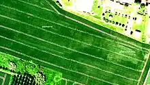 Vue aérienne avec révélation des restes des soubassements du château de Fresnes, et mur de l'ancienne terrasse du grand parterre, 2020.