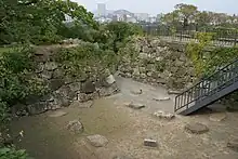 À l'ouest de la citadelle, deux fossés linéaires sont creusés à la confluence des rivières Shiju (devenue rivière Yakuin-shin) et Naka.
