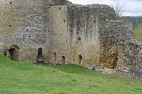 La vaste cour intérieure renfermait des bâtiments résidentiels et des structures domestiques telles que cuisines, puits, celliers, écuries, étables. Ces structures prenaient appui sur la courtine orientale et à l'ouest, près de la tour du Moulin. Il ne subsiste de ces bâtiments, souvent en bois et en torchis, que des fondations et quelques arases.