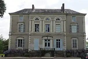 Le premier niveau est composé d'un avant-corps central délimité par un chainage d'angle en tuffeau, flanqué d'une travée de baies quadrangulaires surmontées d'un fronton de part et d'autre. La porte d'entrée couronnée d'un fronton se situe au centre de cet avant-corps. Elle est accessible par un perron desservi par quatre escaliers. Le premier et le deuxième niveau sont séparés par une frise.