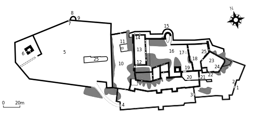 Dans la cour se trouve un puits [17]. À l'ouest se trouve le logis seigneurial (ou palais [13]) de style roman, relativement bien conservé. On peut encore y admirer des fenêtres en plein cintre [12] et des chapiteaux romano-byzantins. À l'est de la cour se trouve le donjon [23], construit sur un promontoire rocheux et supporté au sud par un important arc de décharge [22].