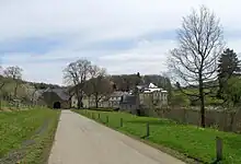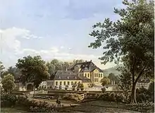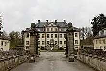 Les deux pavillons de la cour d'honneur sont de Nagel, inspiré par Wehmer. Celui à l'ouest est décoré du double blason matrimonial des Weichs et des Westrem et date de 1731 ; celui du côté est est orné du blason des Weichs et des Galen et date de 1743. La remise du sud est couronnée d'un petit clocheton. le milieu du bâtiment de l'économat à trois étages est dominé par un fronton d'entrée. L'aile ouest consiste en corps de garde à portail (Torhaus) datant de 1736 et surélevé en 1850. Le parc à terrasses à fondement de paraboles est accessible par un petit pont.