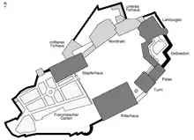 Les sept bâtiments du château sont regroupés selon la forme d'un fer à cheval autour d'une cour intérieure ouverte vers le sud-ouest. La maison bernoise se situe au nord-ouest. L'aile nord comprend le système de portes et constitue l'unique accès. L'ancienne maison du bailli se trouve à l'angle nord-est et rejoint le bastion oriental. Le corps de logis et le donjon au sud-est sont la partie la plus ancienne du site et la maison des chevaliers se trouve au sud.