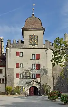 Un étroit escalier en colimaçon mène sur le mur qui atteint une hauteur de onze mètres au-dessus de la cour. Sur trois étages des salles jouxtent l'escalier comme l'indiquent les fenêtres de la façade côté cour. Un portail en arc en plein cintre avec des lésènes et un fronton bordé de sphères marque l'entrée. Un relief partiellement altéré est intégré à la façade ; on peut y reconnaître les armoiries des baillis Hans Weyermann et Daniel Lerber. Le cadran de l'horloge fut peint par H. J. Horer ; son mécanisme fut produit par Tobias Liechti. Sur le côté de la roseraie, une galerie relie la maison du bailli au corps de logis[49]