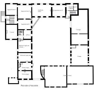 L'ensemble, malgré des façades assez monumentales présente des circulations intérieures et extérieures atypiques et peu hiérarchisées. L'accès au château se fait par une porte cochère, peu différente de celle d'une ferme et la cage d'escalier principale est uniquement accessible après avoir traversé un appartement de parade[2].