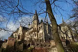 Inspiré entre autres des châteaux de Hohenzollern, Stolzenfels et Sooneck, il est construit entre 1858 et 1867, par les architectes Conrad Wilhelm Hase, Edwin Oppler (en), et Ferdinand Schorbach (de), avec pont-levis, haut donjon, chapelle, 130 chambres sur cinq étages, parc romantique, jardin à l'anglaise, au cœur d'un vaste domaine forestier. Il est richement décoré et meublé en style néo-gothique par les architectes d’intérieur Justus Heinrich Jakob Molthan (de) et Hermann Narten (de), et par le peintre Otto Knille...
