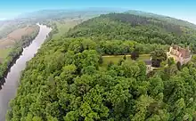 Vue sur la vallée de la Dordogne et le château de Beytout depuis la terrasse du château de Monsec.