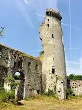 - le donjon circulaire ruiné situé un peu au nord du centre de l'enceinte, difficilement datable mais sans doute postérieur à la destruction du château en 1358-1360 et remanié vers 1409-1411. Pour Nicolas Mengus, la tour maîtresse (fin XIIe début XIIIe siècle) a été surélevée au XVe siècle avec l'adjonction de mâchicoulis[9] ;