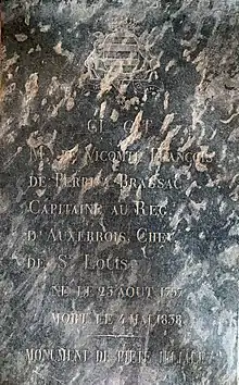 - Ci-git Monsieur le vicomte François de Perrin-Brassac, capitaine au régiment d'Auxerrois, chevalier de Saint Louis, né le 23 août 1757, mort le 4 mai 1838. Monument de piété filiale.