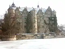 Le château est agrandi au XVe siècle, mais c'est surtout au XVIe siècle que le comte Louis-Casimir de Hohenlohe-Neuenstein le réaménage en château Renaissance. C'est un château haut et puissant à quatre corps de bâtiment fermés, avec l'ancien donjon roman à l'angle nord-ouest. Deux autres angles sont surplombés de tours rondes à toiture. Un pont, décoré des blasons du comte Louis-Casimir et de son épouse, née Anne de Solms-Laubach, mène à l'entrée d'honneur. Les travaux se poursuivent jusqu'au début du XVIIe siècle.