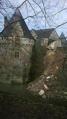 Le vendredi , à la suite de précipitations importantes dues à la tempête Petra, une partie de la courtine sud s'effondre[17]. Le château est fermé pendant l'opération de restauration lancée en , prévue pour une durée minimum de 3 ans et un chantier de 3 millions d’euros[18] : le mur est reconstruit au moyen d’un voile en béton armé habillé par un parement en pierres (réemploi des pierres d’origine encore en bon état et moellons provenant d’une carrière près de Carhaix utilisés en complément) ; douze nouveaux panneaux d'information sont installés autour[19]. Le nouvel aménagement du château est réalisé en six étapes : opération de mapping vidéo sur la façade ; aménagements de la cour intérieure avec des événements temporaires, de l’espace public d’accueil (avec librairie, espaces de restauration, de rencontre et de détente, toilettes…) ; boucle de visite payante au premier étage avec scénographie permanente et expositions temporaires ; salles réservées pour les visites accompagnées et les micro-événements au rez-de-chaussée et au sous-sol ; ateliers et espaces de projets, au rez-de-chaussée[20].