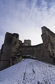 - un escalier permettant d'accéder au chemin de ronde, au fossé et aux tours de la prison et tour du puits, toutes deux ruinées.