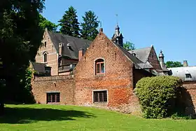 Celle-ci est délimitée à gauche et à droite par des bâtiments annexes, appelés « communs », édifiés en briques et recouverts d'une toiture d'ardoise percée de nombreuses lucarnes.