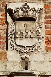 ![]() Les armoiries et les devises de la Maison de Merode sur le portail occidental. |
